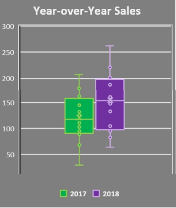 A software company launched a new product in late 2016. The product manager is reviewing a Box and Whisker plot used to compare year-over-year sales, from 2017 to 2018. What is the conclusion he can make from this chart?