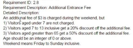 The requirement given in the image specifies an additional fee of $3 that is charged during the weekend, with some exceptions and discounts based on the age of the visitors. To test this requirement, we can use boundary value analysis, which is a specification-based test technique that involves testing the values at or near the boundaries of an equivalence partition. An equivalence partition is a set of values that are expected to be treated in the same way by the system under test. For example, based on the requirement, we can identify the following equivalence partitions for the input age: