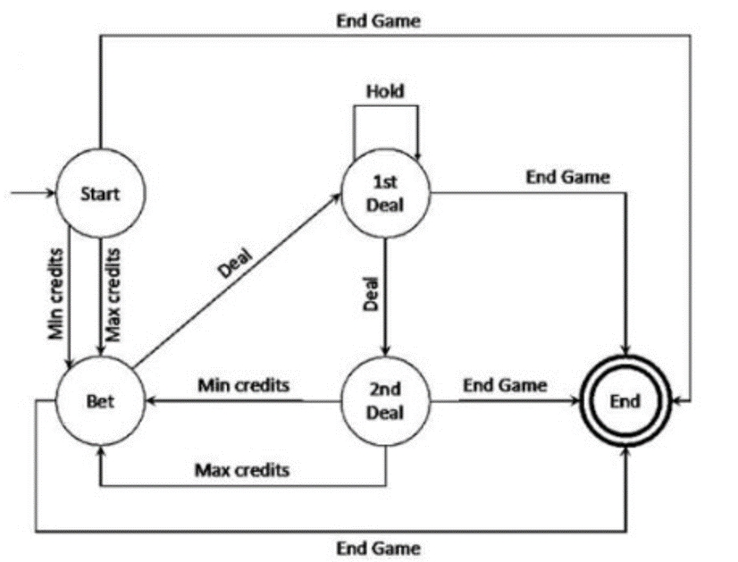 Consider the following simplified version of a state transition diagram that specifies the behavior of a video poker game: