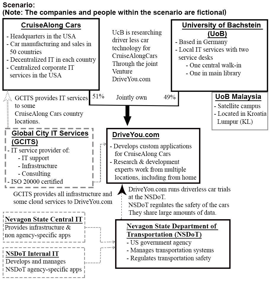 This is a small, innovative company, that is jointly owned by CruiseAlong Cars and the University of Bachstein (UoB). DriveYou.com develops custom applications using a highly collaborative, rapid and iterative development approach. Their employees are mostly research and development experts, working from multiple locations, with a significant number working from home. Initial driverless car testing is being conducted in the US at the Nevegon State Department of Transportation.