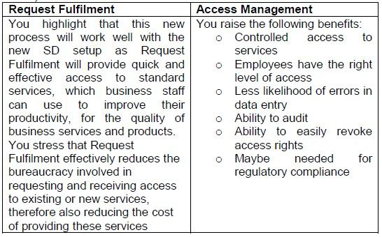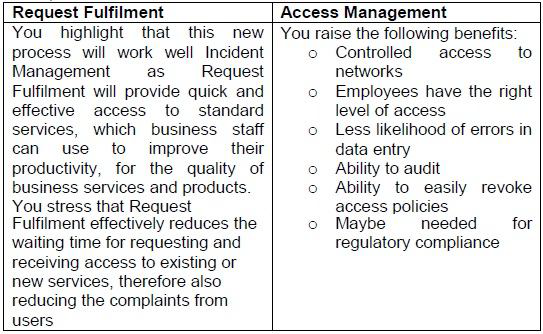 There is some confusion as to how the process of Access Management should be designed. In particular, there is debate as to how the process should be integrated into the overall approach of IT Service Management within Vision Media. The IT director has asked for submissions from some of her staff, describing how they think Access Management should be designed.