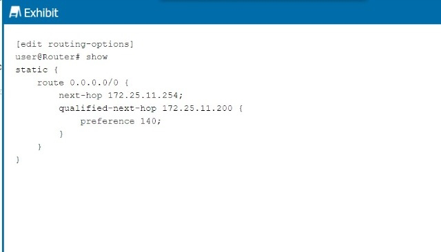 In the exhibit, we see two next-hop addresses for the default static route (0.0.0.0/0):The first next hop is 172.25.11.254, with no specified preference.The second next hop is 172.25.11.200, with a specified preference of 140.Step-by-Step Breakdown:Default Static Route Preference:If no preference is explicitly set for a next hop in Junos, it defaults to 5 for static routes.Determining Preference:In this case, the next hop 172.25.11.254 does not have an explicit preference defined, so it will use the default value of 5. The second next hop has a preference of 140, which is higher, meaning it will only be used if the primary next hop is unavailable.JuniperReference:Static Route Preference: In Junos, the default preference for static routes is 5, and this value is applied unless overridden by the preference parameter.