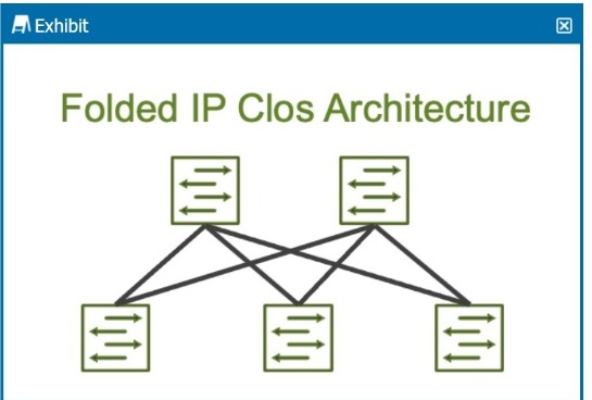 The exhibit shows a Folded IP Clos Architecture, which is also referred to as a 3-stage Clos network design. This architecture typically consists of two layers of switches:Spine Layer: The top row of switches.Leaf Layer: The bottom row of switches.Step-by-Step Breakdown:Clos Architecture:A 3-stage Clos network has two types of devices: spine and leaf. In this design, each leaf switch connects to every spine switch, providing a high level of redundancy and load balancing.Stage Explanation:Stage 1: The first set of leaf switches.Stage 2: The spine switches.Stage 3: The second set of leaf switches.The Folded Clos architecture shown here effectively 'folds' the 3-stage design by combining the ingress and egress leaf layers into one, reducing it to two visible layers, but still maintaining the overall 3-stage architecture.JuniperReference:IP Clos Architecture: The 3-stage Clos design is commonly used in modern data centers for high availability, redundancy, and scalability.