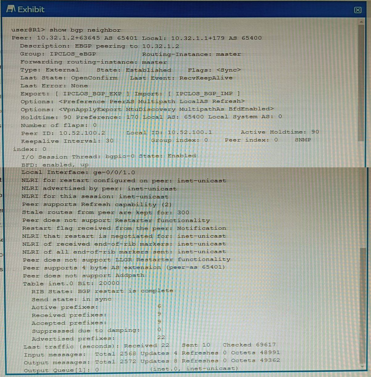 Option C suggests that R1 is configured for AS 65400.This is also correct because in the output, it's shown that the local AS number is 654001.The local AS number represents the Autonomous System (AS) number of the router on which you're checking the BGP session1.