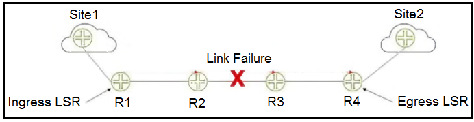 Referring to the exhibit, you have an established RSVP LSP between R1 and R4 when you experience a link failure between R2 and R3.