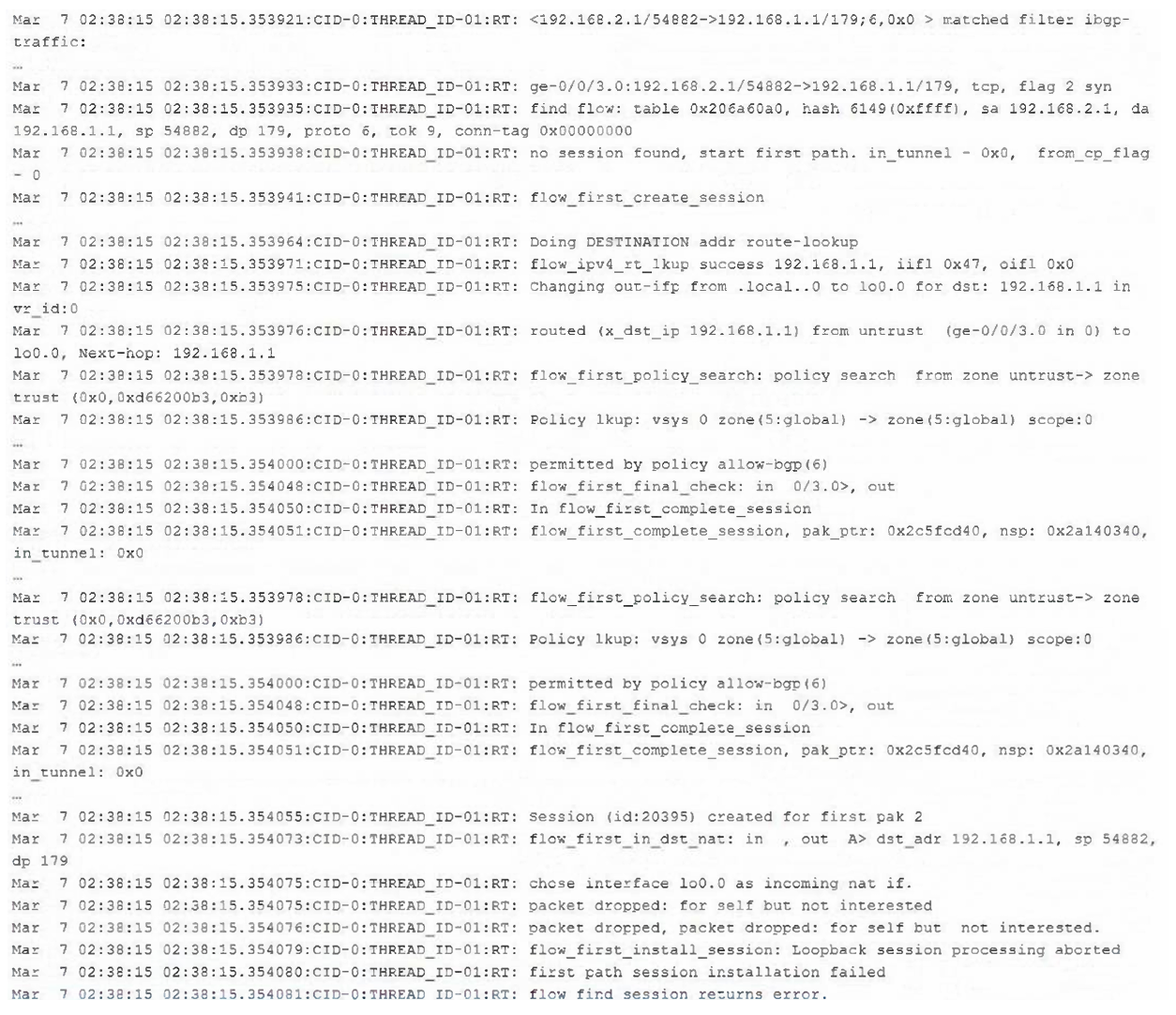 You are asked to establish IBGP between two nodes, but the session is not established. To troubleshoot this problem, you configured trace options to monitor BGP protocol message exchanges.