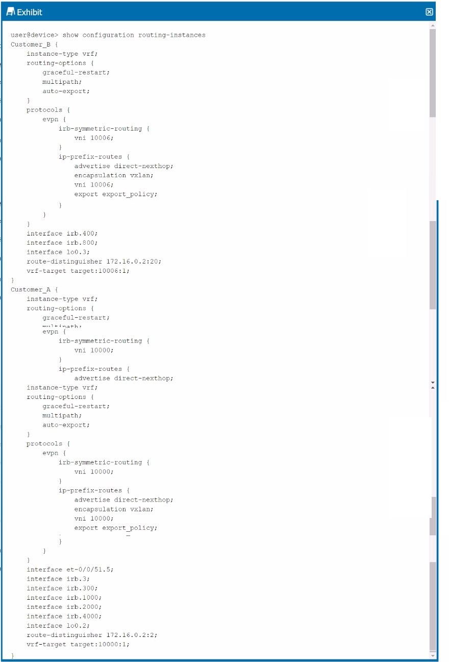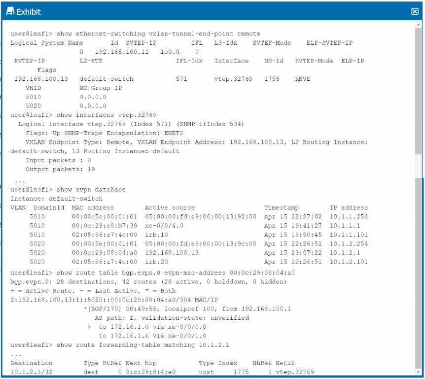 Understanding the Output:The show evpn database command output shows the MAC address, VLAN, active source, timestamp, and IP address associated with various hosts in the EVPN instance.Analysis of the MAC Address:Option A: The MAC address 40:00:dc:01:00:04 is associated with the IP address 10.4.4.5, as indicated by the output in the IP address column. This confirms that this host has been assigned the IP 10.4.4.5.Option D: The active source for the MAC address 40:00:dc:01:00:04 is listed as 00:02:00:00:00:04:00:04:00:00:04:00:04, which indicates that the host is connected via an ESI (Ethernet Segment Identifier) LAG (Link Aggregation Group). This setup is typically used in multi-homing scenarios to provide redundancy and load balancing across multiple physical links.Conclusion:Option A: Correct---The host with MAC 40:00:dc:01:00:04 is assigned IP 10.4.4.5.Option D: Correct---The host is originating from an ESI LAG, as indicated by the active source value.