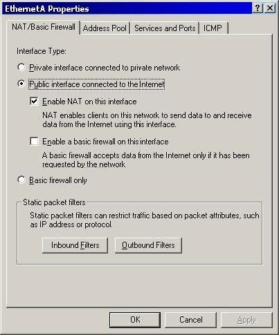 3. For EthernetA, configure NAT/Basic Firewall as 'Private interface connected to private network'.