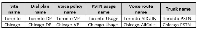 You have a Skype for Business Server 2015 Infrastructure. The infrastructure contains two sites and is configured for Enterprise Voice. The sites are located in Chicago and Toronto. Each site has a distinct voice policy, public switched telephone network (PSTN) usage, voice route, and trunk transaction rule as shown in the following table: