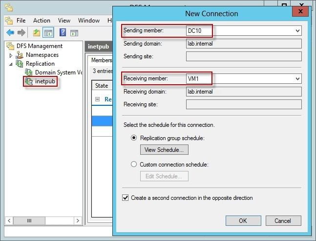 A: The Bridge all site links option in Active Directory must be enabled. (This option is available in the Active Directory Sites and Services snap-in.) Turning off Bridge all site links can affect the ability of DFS to refer client computers to target computers that have the least expensive connection cost. An Intersite Topology Generator that is running Windows Server 2003 relies on the Bridge all site links option being enabled to generate the intersite cost matrix that DFS requires for its site-costing functionality. If you turn off this option, you must create site links between the Active Directory sites for which you want DFS to calculate accurate site costs.Any sites that are not connected by site links will have the maximum possible cost.   References: http://faultbucket.ca/2012/08/fixing-a-dfsr-connection-problem/http://technet.microsoft.com/en-us/library/cc771941.aspx