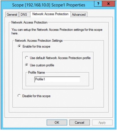 To configure a NAP-enabled DHCP server On the DHCP server, click Start, click Run, in Open, type dhcpmgmt. smc, and then press ENTER. In the DHCP console, open <servername>\IPv4. Right-click the name of the DHCP scope that you will use for NAP client computers, and then click Properties. On the Network Access Protection tab, under Network Access Protection Settings, choose Enable for this scope, verify that Use default Network Access Protection profile is selected, and then click OK. In the DHCP console tree, under the DHCP scope that you have selected, right-click Scope Options, and then click Configure Options. On the Advanced tab, verify that Default User Class is selected next to User class. Select the 003 Router check box, and in IP Address, under Data entry, type the IP address for the default gateway used by compliant NAP client computers, and then click Add. Select the 006 DNS Servers check box, and in IP Address, under Data entry, type the IP address for each router to be used by compliant NAP client computers, and then click Add. Select the 015 DNS Domain Name check box, and in String value, under Data entry, type your organization's domain name (for example, woodgrovebank. local), and then click Apply. This domain is a full-access network assigned to compliant NAP clients. On the Advanced tab, next to User class, choose Default Network Access Protection Class. Select the 003 Router check box, and in IP Address, under Data entry, type the IP address for the default gateway used by noncompliant NAP client computers, and then click Add. This can be the same default gateway that is used by compliant NAP clients. Select the 006 DNS Servers check box, and in IP Address, under Data entry, type the IP address for each DNS server to be used by noncompliant NAP client computers, and then click Add. These can be the same DNS servers used by compliant NAP clients. 13.Select the 015 DNS Domain Name check box, and in String value, under Data entry, type a name to identify the restricted domain (for example, restricted. Woodgrovebank. local), and then click OK. This domain is a restricted-access network assigned to noncompliant NAP clients. Click OK to close the Scope Options dialog box. Close the DHCP console. Reference: http: //technet.microsoft.com/en-us/library/dd296905%28v=ws.10%29.aspx