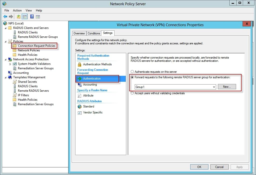 Server1 is configured as a RADIUS proxy that forwards connection requests to a remote RADIUS server group named Group1.