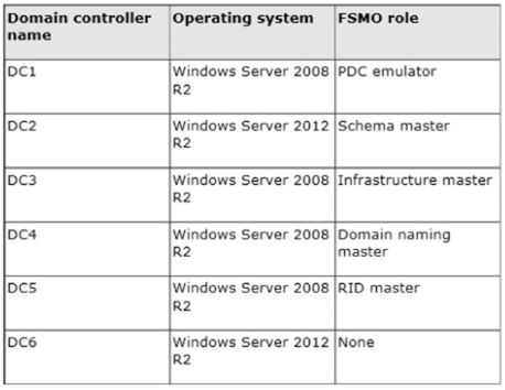 Your network contains an Active Directory domain named contoso.com. The domain contains six domain controllers. The domain controllers are configured as shown in the following table.