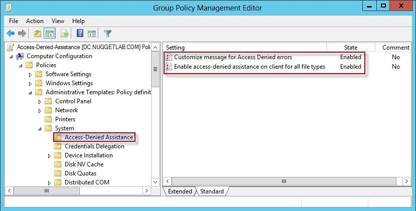 The Enable access-denied assistance on client for all file types policy should be enabled to force client computers to participate in Access-Denied Assistance. Again, you must make sure to target your GPO scope accordingly to "hit" your domain workstations as well as your Windows Server 2012 file servers.