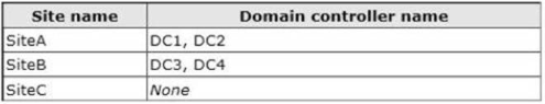 Your network contains an Active Directory forest named contoso.com. The forest contains a single domain. The forest contains three Active Directory sites named SiteA, SiteB, and SiteC. The sites contain four domain controllers. The domain controllers are configured as shown in the following table.