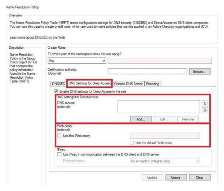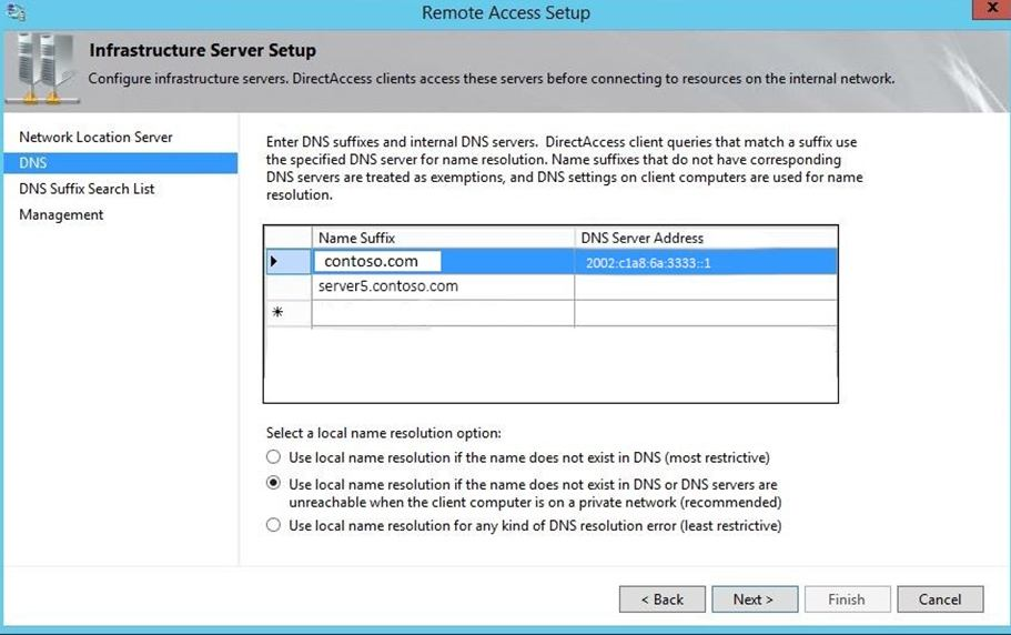 Note: For split-brain DNS deployments, you must list the FQDNs that are duplicated on the Internet and intranet and decide which resources the DirectAccess client should reach, the intranet version or the public (Internet) version. For each name that corresponds to a resource for which you want DirectAccess clients to reach the public version, you must add the corresponding FQDN as an exemption rule to the NRPT for your DirectAccess clients. Name suffixes that do not have corresponding DNS servers are treated as exemptions.