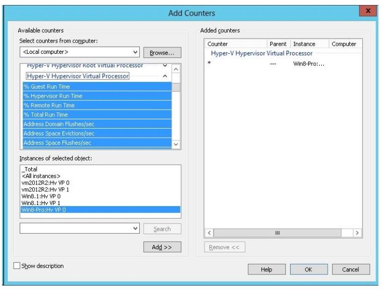 The “Hyper-V Hypervisor Root Virtual Processor”and “Hyper-V Hypervisor Virtual Processor” are just slices of the LP counter and can help you understand how much total CPU the root and guests are using on the system. The goal here is to monitor VM1 through Server1. Hyper-V Hypervisor Virtual Processor will do that.    References:http://social.technet.microsoft.com/wiki/contents/articles/1234.hyper-v-concepts-vcpu-virtual-processor.aspxhttp://blogs.msdn.com/b/tvoellm/archive/2008/05/12/hyper-v-performance-counters-part-four-of-many-hyper-v-hypervisor-virtual-processor-and- hyper-v-hypervisor-root-virtual-processor-counter-set.aspx