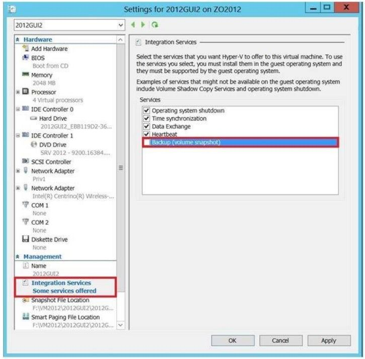 Integration Services settings on virtual machines includes services such as operating system shutdown, time synchronization, data exchange, Heart beat, and Backup (volume snapshot services. Thus you should disable the time synchronization using Integration Services.   References:http://blogs.technet.com/b/virtualization/archive/2008/08/29/backing-up-hyper-v-virtual-machines.aspxExam Ref 70-410, Installing and Configuring Windows Server 2012, Chapter 3: Configure Hyper-V, Objective 3.1: Create and Configure virtual machine settings, p. 144
