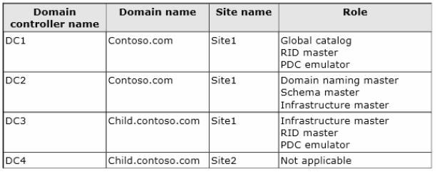 The forest contains two domains named contoso.com and child.contoso.com and two sites named Site1 and Site2. The domains and the sites are configured as shown in following table.