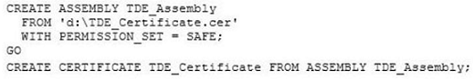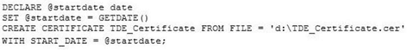 To create a database protected by transparent data encryption The following procedures show you have to create a database protected by TDE using SQL Server Management Studio and by using Transact-SQL. Using SQL Server Management Studio 1. Create a database master key and certificate in the master database.  2. Create a backup of the server certificate in the master database. Etc. In transact sql:-- Create a database master key and a certificate in the master database.   USE master ;   GO   CREATE MASTER KEY ENCRYPTION BY PASSWORD = '*rt@40(FL&dasl1';   GO   CREATE CERTIFICATE TestSQLServerCert    WITH SUBJECT = 'Certificate to protect TDE key'   GO   -- Create a backup of the server certificate in the master database.   -- The following code stores the backup of the certificate and the private key file in the default data location for this instance of SQL Server    -- (C:\Program Files\Microsoft SQL Server\MSSQL13.MSSQLSERVER\MSSQL\DATA).  BACKUP CERTIFICATE TestSQLServerCert    TO FILE = 'TestSQLServerCert'   WITH PRIVATE KEY    (       FILE = 'SQLPrivateKeyFile',       ENCRYPTION BY PASSWORD = '*rt@40(FL&dasl1'   );   GO   Etc. ' References:https://docs.microsoft.com/en-us/sql/relational-databases/security/encryption/move-a-tde-protected-database-to-another-sql-server
