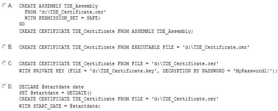 To create a database protected by transparent data encryption The following procedures show you have to create a database protected by TDE using SQL Server Management Studio and by using Transact-SQL. Using SQL Server Management Studio 1. Create a database master key and certificate in the master database. 2. Create a backup of the server certificate in the master database. Etc. In transact sql:-- Create a database master key and a certificate in the master database. USE master ; GO CREATE MASTER KEY ENCRYPTION BY PASSWORD = '*rt@40(FL&dasl1'; GO CREATE CERTIFICATE TestSQLServerCert WITH SUBJECT = 'Certificate to protect TDE key' GO -- Create a backup of the server certificate in the master database. -- The following code stores the backup of the certificate and the private key file in the default data location for this instance of SQL Server -- (C:\Program Files\Microsoft SQL Server\MSSQL13.MSSQLSERVER\MSSQL\DATA). BACKUP CERTIFICATE TestSQLServerCert TO FILE = 'TestSQLServerCert' WITH PRIVATE KEY ( FILE = 'SQLPrivateKeyFile', ENCRYPTION BY PASSWORD = '*rt@40(FL&dasl1' ); GO Etc. ' References:https://docs.microsoft.com/en-us/sql/relational-databases/security/encryption/move-a-tde-protected-database-to-another-sql-server