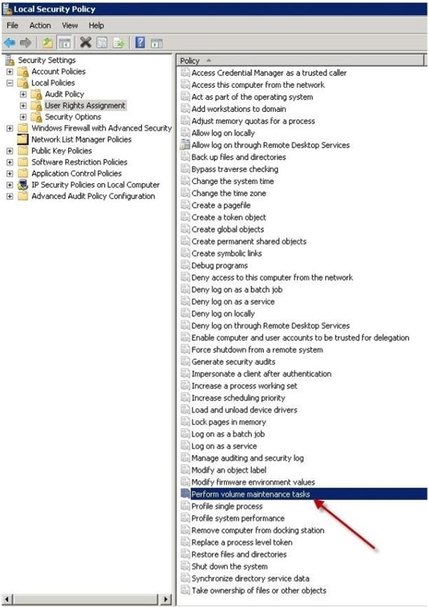 2. Double click Perform Volume Maintenance Tasks and add your SQL Server database engine service account.