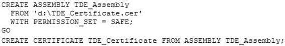 To create a database protected by transparent data encryption The following procedures show you have to create a database protected by TDE using SQL Server Management Studio and by using Transact-SQL. Using SQL Server Management Studio 1. Create a database master key and certificate in the master database.  2. Create a backup of the server certificate in the master database. Etc. In transact sql:-- Create a database master key and a certificate in the master database.   USE master ;   GO   CREATE MASTER KEY ENCRYPTION BY PASSWORD = '*rt@40(FL&dasl1';   GO   CREATE CERTIFICATE TestSQLServerCert    WITH SUBJECT = 'Certificate to protect TDE key'   GO   -- Create a backup of the server certificate in the master database.   -- The following code stores the backup of the certificate and the private key file in the default data location for this instance of SQL Server    -- (C:\Program Files\Microsoft SQL Server\MSSQL13.MSSQLSERVER\MSSQL\DATA).  BACKUP CERTIFICATE TestSQLServerCert    TO FILE = 'TestSQLServerCert'   WITH PRIVATE KEY    (       FILE = 'SQLPrivateKeyFile',       ENCRYPTION BY PASSWORD = '*rt@40(FL&dasl1'   );   GO   Etc. ' References:https://docs.microsoft.com/en-us/sql/relational-databases/security/encryption/move-a-tde-protected-database-to-another-sql-server