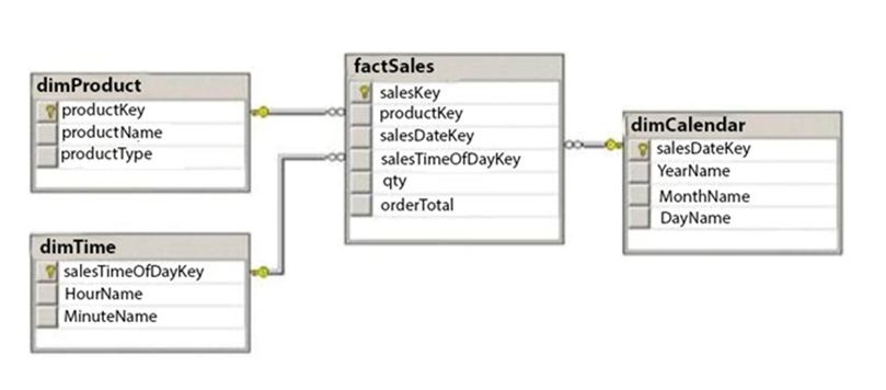 You are reviewing the design of an existing fact table named factSales, which is loaded from a SQL Azure database by a SQL Server Integration Services (SSIS) package each day. The fact table has approximately 1 billion rows and is dimensioned by product, sales date, and sales time of day.
