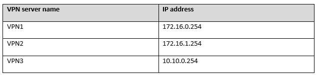 Your network contains an Active Directory forest named contoso.com. The forest contains the VPN servers configured as shown in the following table.