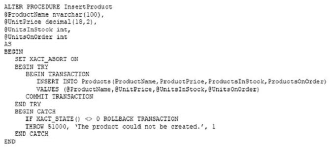 With X_ABORT ON the INSERT INTO statement and the transaction will be rolled back when an error is raised, it would then not be possible to ROLLBACK it again in the IF XACT_STATE() <> O ROLLBACK TRANSACTION statement. Note: A transaction is correctly defined for the INSERT INTO ..VALUES statement, and if there is an error in the transaction it will be caughtant he transaction will be rolled back, finally an error 51000 will be raised.Note: When SET XACT_ABORT is ON, if a Transact-SQL statement raises a run-time error, the entire transaction is terminated and rolled back.XACT_STATE is a scalar function thatreports the user transaction state of a current running request. XACT_STATE indicates whether the request has an active user transaction, and whether the transaction is capable of being committed. The states of XACT_STATE are:0 There is no active user transaction for the current request. 1 The current request has an active user transaction. The request can perform any actions, including writing data and committing the transaction. 2 The current request has an active user transaction, but an error hasoccurred that has caused the transaction to be classified as an uncommittable transaction. References:https://msdn.microsoft.com/en-us/library/ms188792.aspxhttps://msdn.microsoft.com/en-us/library/ms189797.aspx