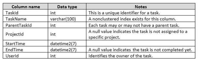 You query a database that includes two tables: Project and Task. The Project table includes the following columns: