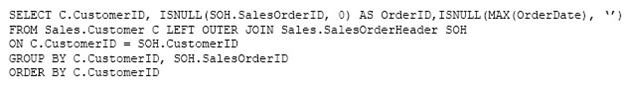You need to create a list of all customers, the order ID for the last order that the customer placed, and the date that the order was placed. For customers who have not placed orders, you must substitute a zero for the order ID and 01/01/1990 for the date.