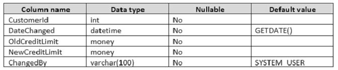 Where the value of the CustomerID column equals 3, you need to update the value of the CreditLimit column to 1000 for the customer. You must ensure that the change to the record in the Customer table is recorded on the CustomerAudit table.