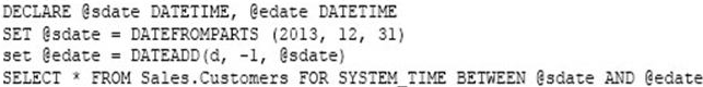 The datetime datetype defines a date that is combined with a time of day with fractional seconds that is based on a 24-hour clock. The DATEFROMPARTS function returns a date value for the specified year, month, and day. Incorrect Answers:A: ValidFrom should be less (<) than @sdate AND ValidTo should be greater (>) than @edate.B: We should add a day with DATEADD, not subtract one day.C: We cannot compare a date to an exact datetime.References: https://msdn.microsoft.com/en-us/library/ms187819.aspx