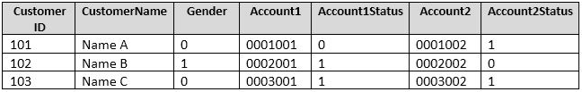 2. Split the table into two separate tables. Include AccountNumber, CustomerID, CustomerName and Gender columns in the first table. Include the AccountNumber and AccountStatus columns in the second table.