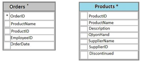 The Products table needs a primary key constraint on the ProductID field. The Orders table needs a foreign key constraint on the productID field, with a reference to the ProductID field in the Products table.