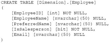 You manage a data warehouse in a Microsoft SQL Server instance. Company employee information is imported from the human resources system to a table named Employee in the data warehouse instance. The Employee table was created by running the query shown in the Employee Schema exhibit. (Click the Exhibit button.)