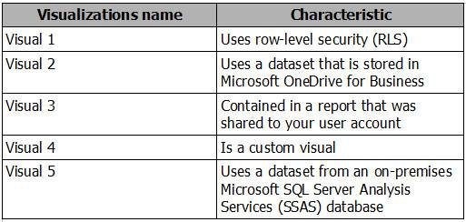 Your Power BI infrastructure contains the visualizations configured as shown in the following table.