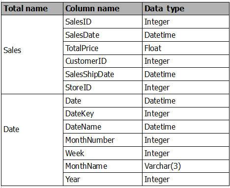 You have a Power BI model that contains two tables named Sales and Date. Sales contains four columns named TotalCost, DueDate, ShipDate, and OrderDate. Date contains one column named Date.