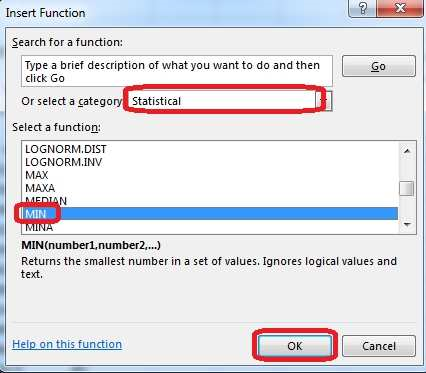 Step 2: In the Insert Function dialog box select Category Statistical, select function MIN, and click OK.