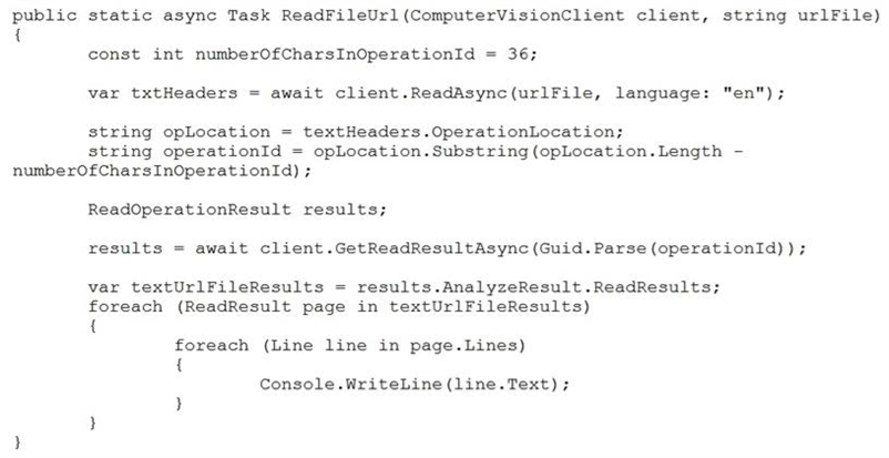 You are developing a method that uses the Computer Vision client library. The method will perform optical character recognition (OCR) in images. The method has the following code.