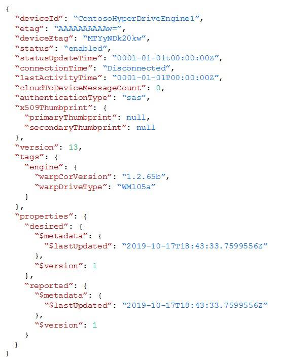 Box 1: tags.engine.warpDriveType='VM105a'Use tags to target twins. Before you create a configuration, you must specify which devices or modules you want to affect. Azure IoT Hub identifies devices and using tags in the device twin, and identifies modules using tags in the module twin.Box 2: properties.desired.warpOperating The twin path, which is the path to the JSON section within the twin desired properties that will be set.For example, you could set the twin path to properties.desired.chiller-water and then provide the following JSON content:{"temperature": 66,"pressure": 28}Reference: https://docs.microsoft.com/en-us/azure/iot-hub/iot-hub-automatic-device-management