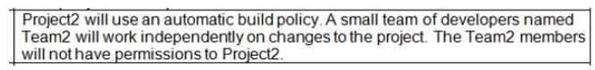 Enable Team2 to work independently on changes to a copy of Project2. Ensure that any intermediary changes performed by Team2 on a copy of Project2 will be subject to the same restrictions as the ones defined in the build policy of Project2.