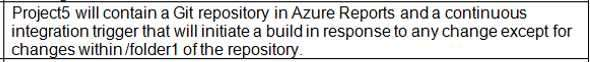Step 1: Create a repository A Git repository, or repo, is a folder that you've told Git to help you track file changes in. You can have any number of repos on your computer, each stored in their own folder. Step 2: Create a branch Branch policies help teams protect their important branches of development. Policies enforce your team's code quality and change management standards. Step 3: Add a build validation policy When a build validation policy is enabled, a new build is queued when a new pull request is created or when changes are pushed to an existing pull request targeting this branch. The build policy then evaluates the results of the build to determine whether the pull request can be completed. Scenario: Implement a code flow strategy for Project2 that will: Enable Team2 to submit pull requests for Project2. Enable Team2 to work independently on changes to a copy of Project2. Ensure that any intermediary changes performed by Team2 on a copy of Project2 will be subject to the same restrictions as the ones defined in the build policy of Project2. References: https://docs.microsoft.com/en-us/azure/devops/repos/git/manage-your-branches