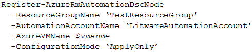 PS C:\>Import-AzureRmAutomationDscConfiguration -AutomationAccountName "Contoso17"-ResourceGroupName "ResourceGroup01" -SourcePath "C:\DSC\client.ps1" -Force