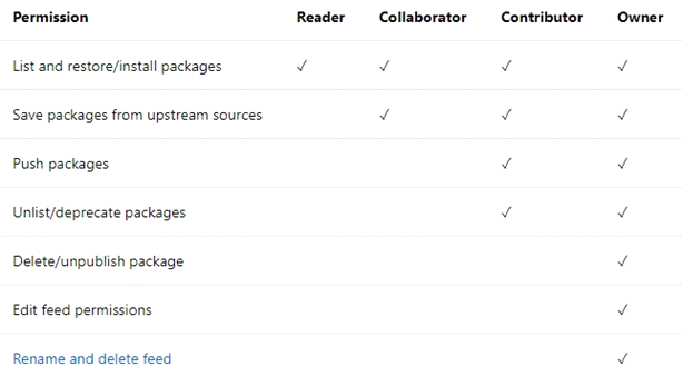 Box 1: Reader Members of a group named Developers must be able to install packages.  Feeds have four levels of access: Owners, Contributors, Collaborators, and Readers. Owners can add any type of identity-individuals, teams, and groups-to any access level.  Box 2: Owner Members of a group named Team Leaders must be able to create new packages and edit the permissions of package feeds.