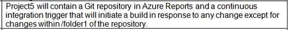 Scenario:           Projects ill contain a Git repository in Azure Reports and a continuous integration trigger that will initiate a build in response to any change except for chan es within /folder1 of the re osito .  References: https://docs.microsoft.com/en-us/azure/devops/pipelines/build/triggers