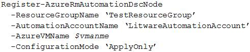 Change the ConfigurationMode parameter from ApplyOnly to ApplyAndAutocorrect. The Register-AzureRmAutomationDscNode cmdlet registers an Azure virtual machine as an APS Desired State Configuration (DSC) node in an Azure Automation account. Scenario: Current Technical IssueThe test servers are configured correctly when first deployed, but they experience configuration drift over time. Azure Automation State Configuration fails to correct the configurations. Azure Automation State Configuration nodes are registered by using the following command.   References:https://docs.microsoft.com/en-us/powershell/module/azurerm.automation/register-azurermautomationdscnode?view=azurermps-6.13.0