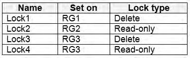 There are no locks on RG4, while the other resource groups have either Delete or Read-only locks.