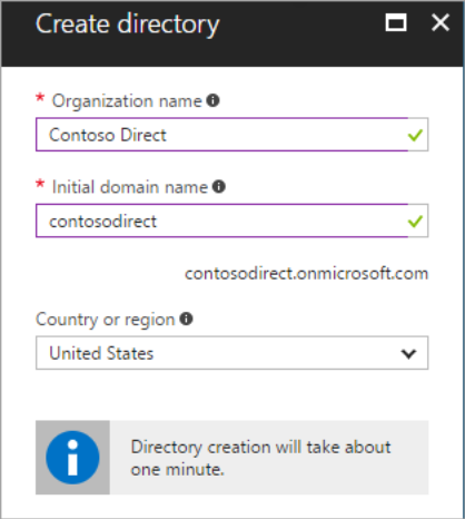 5. Provide an Organization name (12345678) and an Initial domain name (12345678). Then select Create. This will create the directory named 12345678.onmicrosoft.com.